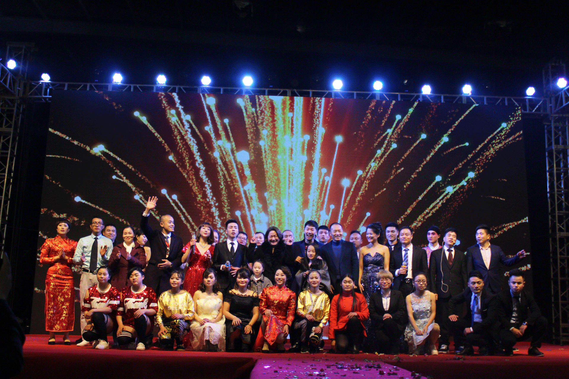 温馨浪漫的晚会现场,美轮美奂的舞台,精彩的表演与美味佳肴相得益彰。一边欣赏家人们用心准备的表演,一边大快朵颐的品尝美食,每个人脸上都洋溢着幸福、满足的笑容。小品《甄选太子》,全程笑点不断,台下更是掌声不断;火热劲爆的集体舞,带动了现场的气氛;俊男美女们带来的时装秀,引来无数尖叫;还有感人肺腑的诗朗诵《勇往直前》,优雅的萨克斯《西班牙斗牛士》,经典戏曲《樊梨花》等等,每一个表演都精彩绝伦。