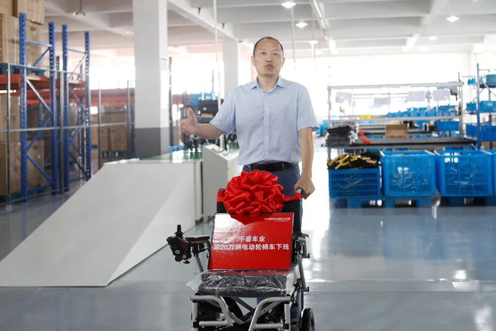 2022年4月26日,千喜集团医疗器械新车间开工启动仪式暨千喜车业第20万辆电动轮椅车下线庆祝会在七号厂房三楼医疗器械生产车间盛大举行。千喜集团董事长姚湘江、千喜集团总裁徐春华、千喜集团党支部书记胡仲以及千喜车业医疗器械事业部全体领导职工齐聚一堂,共同见证了医疗器械新流水线开机运转的辉煌一刻。